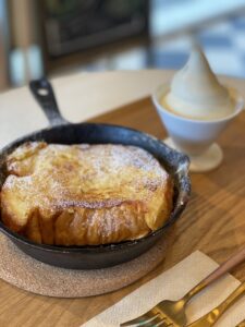 ヨーグルト食パンを使用したフレンチトースト。別添えのソフトクリームにヨーグルソースがかかっています。1日5食限定。