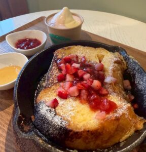 苺がたっぷり使用したフレンチトースト。苺の飲めるヨーグルト掛けのソフトクリームと、追い苺ソースとはちみつソースセット