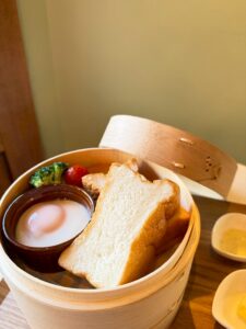 9:00~11:00ヨーグルト食パン・温玉・蒸し野菜。セットの自家製ヨーグルトドレッシング・バター・岩塩でおめしあがりください。