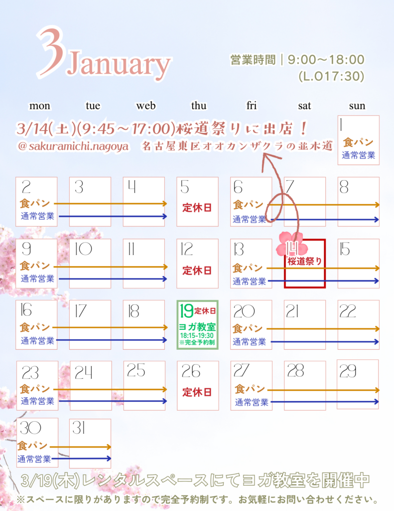 3月ショップスケジュール 未分類 2026.02.28BOBRUNCHのHPをご覧の皆様こんにちは。いつもHPをご覧いただきありがとうございます。3月のショップスケジュールをお知らせいたします!(定休日:木曜日)3月は名古屋市東区の桜道祭りに出店します!日程:3/14(土)時間:9:45~17:00詳細:チラシをチェック春スイーツを開発しています!是非お立ち寄りください!