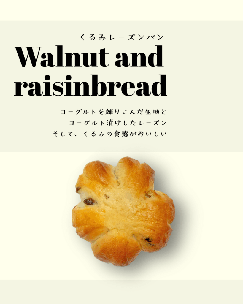 ヨーグルトを練りこんだ生地と、ヨーグルト漬けしたレーズン。そして、くるみの食感を楽しめるミニパンとなっています。