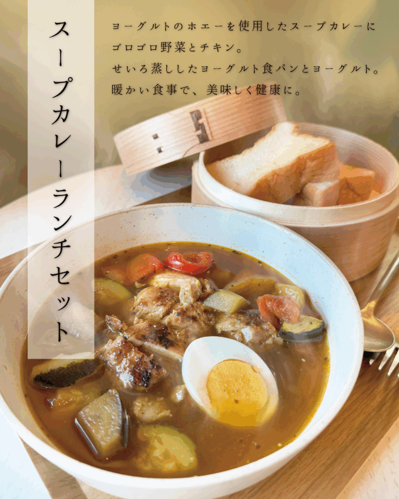 こちらのスープカレーにはヨーグルトを作る際にでるホエーを使用しています!