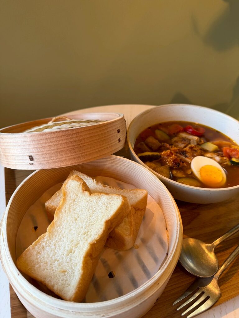 セットに付いているヨーグルト食パンは、セイロの自然素材(竹や杉など)の香りがほのかにパンに移り、自然な風味をプラスされ、素材本来の旨味や甘みを引き出し、シンプルな味わいを楽しめます。